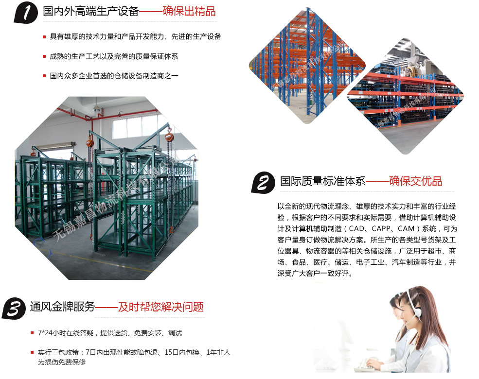 無錫嘉昌倉儲貨架有限公司擁有多年的設(shè)計、生產(chǎn)、管理經(jīng)驗。以全新的現(xiàn)代物流理念、雄厚的技術(shù)實力和豐富的行業(yè)經(jīng)驗,根據(jù)客戶的不同要求和實際需要,借助計算機輔助設(shè)計及計算機輔助制造(CAD、CAPP、CAM)系統(tǒng),可為客戶量身訂做物流解決方案。所生產(chǎn)的各類型號貨架及工位器具、物流容器的等相關(guān)倉儲設(shè)施,廣泛用于超市、商場、食品、醫(yī)療、儲運、電子工業(yè)、汽車制造等行業(yè),并深受廣大客戶一致好評。